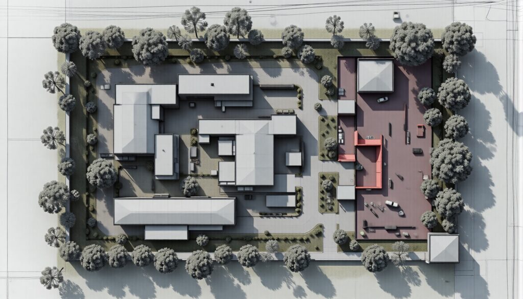 Overhead views of a property showing the arrangement of buildings landscape features and other site elements. Site plans provide context and illustrate how a project relates to its surroundings.