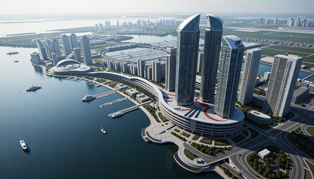 Aerial Integration combines actual aerial photographs with 3D rendered elements to create visualizations of architectural projects in their real environment. This technique helps architects and developers show how new buildings will fit into existing neighborhoods.