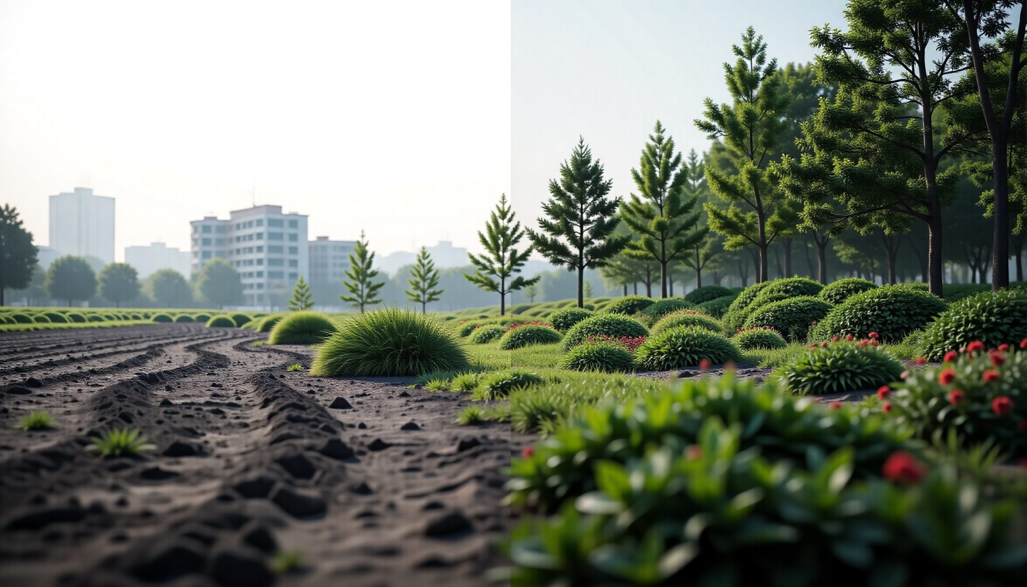 Time-lapse visualizations showing how landscaping and vegetation around a building or in an urban area might grow and change over years or decades.