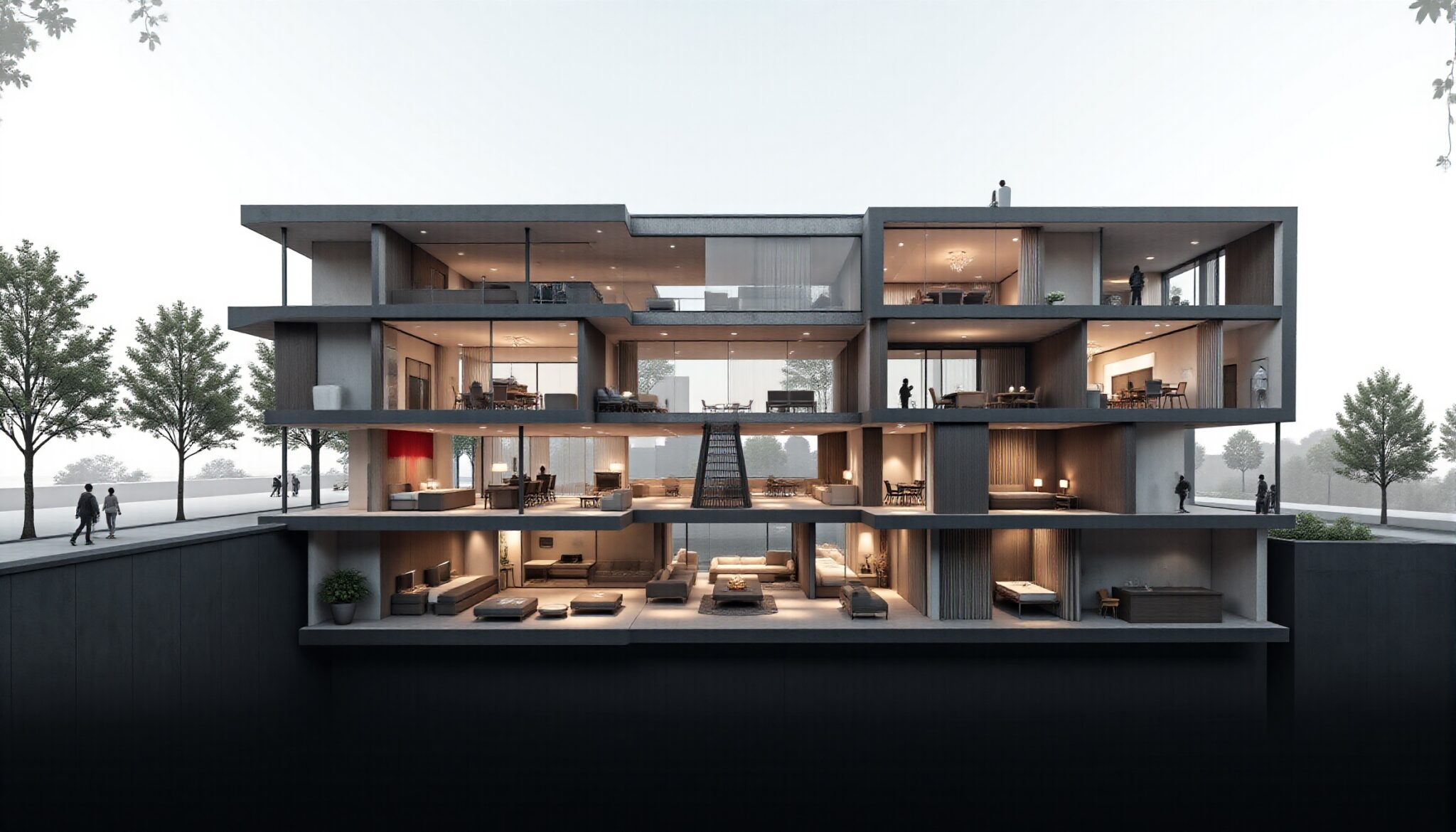 A section visualization is like a cutaway view of a building, showing what you’d see if you sliced through the structure. Unlike basic technical section drawings, visualization sections use color, materials, lighting, and detail to reveal internal spaces and construction in a way anyone can understand. They expose the relationships between floors, show how systems work together, and reveal hidden architectural features.