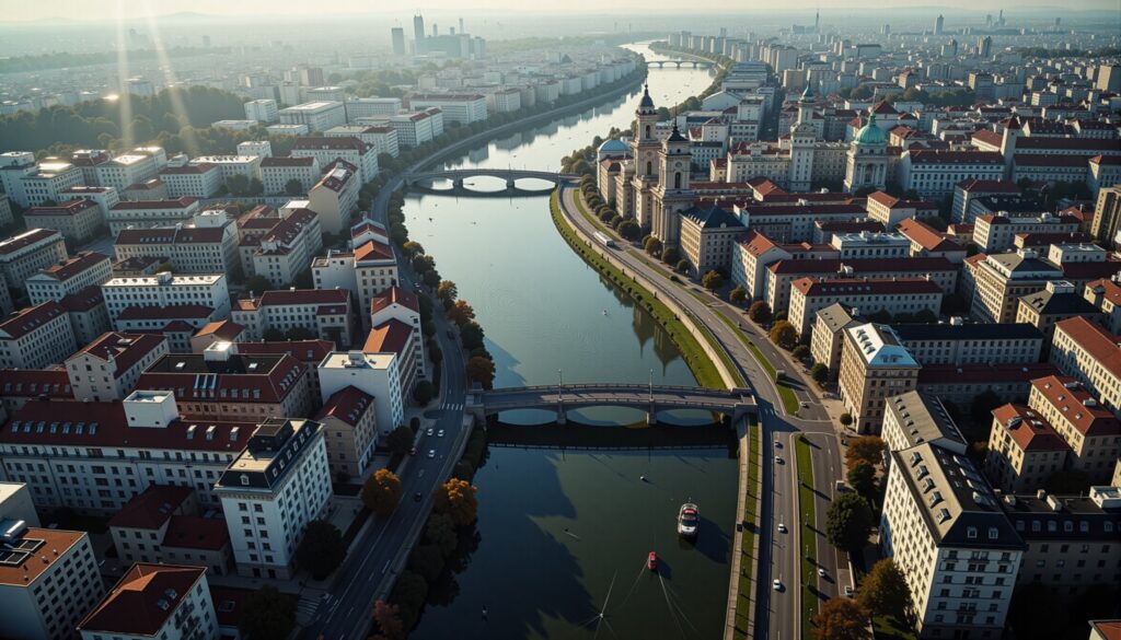 High-altitude photographs typically taken from aircraft providing a broad overview of large areas. These images offer unique perspectives on landscapes urban environments and architectural projects.